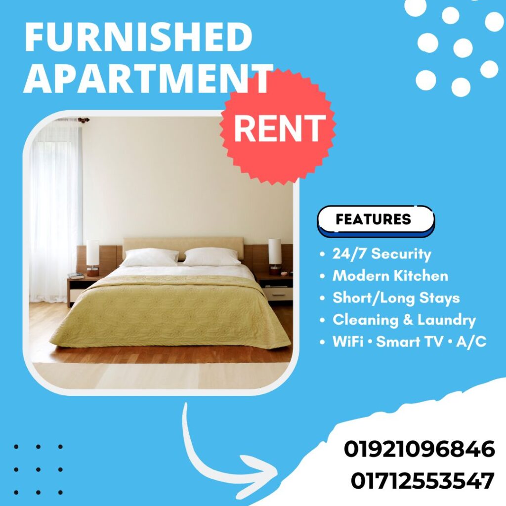 Furnished 3-Bedroom Apartment for Rent in Bashundhara R/A with Premium Services. Offers Short/long Term Rentals, a fully equipped Kitchen, TV, Geyser, Fridge, WiFi, Microwave, and AC.